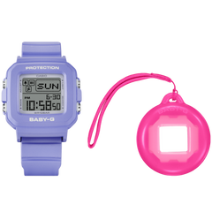 Mix, match, make it your own! A brand-new BABY-G + PLUS series to celebrate the 30th anniversary of BABY-G in 2024. The BGD10K, a compact digital watch and case holder set, comes with bezel and band that can easily be detached — no need for any special tools. Wear it as a wristwatch or place the center case into the holder, turning the watch into a unique time-telling charm. Hang it from your waist or bag — enjoy the freedom of mixing and matching to suit your mood and outfit each day. Pop-casual color variations are inspired by the trendy Y2K fashion colors that are back in style. Add stickers to the silicone holder; decorate it your way to really make it your own. Decorate the top and sides of the silicone holder’s acrylic panels to really make it your own.The LCD on the upper right rotates at 30-second intervals through five retro-style pixel-art animations featuring a cast of characters that includes a dog and cat for an added touch of fun.Not just amusing, but practical, as well. The BGD10K also delivers shock-resistant construction, 100-meter water resistance, and plenty of handy functions. * Silicone holder with strap・Store in cool, dry place out of direct sunlight. ・Attaching metal straps may damage strap holes.・Wrinkle-like patterns may appear on surface due to the manufacturing process that gives the holder its glossy finish.* Decorating the holder・Adding decoration to the watch itself is not recommended.・Some stickers may not adhere well to holder.・Before applying stickers, wipe the holder to remove surface dust, oil, liquid, and other substances.・Stickers may peel away depending on where on the holder they are placed and how the holder is used.・Stickers left on the holder for a long period may leave adhesive residue behind.