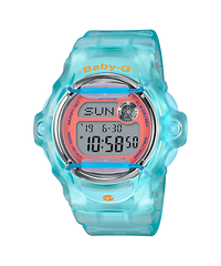 From BABY-G, the casual watch for active women, come new models with a 90s culture theme. These designs feature vivid pop colors like those used in the games, music players, and cassettes that were popular in the 1990s.This lineup features a choice of the BG-169, which is a popular choice, features a compact form and face protector, along with semi-transparent material for the case and band. The blue model has an orange face, while the pink model has a red face, creating striking pop color designs. These new BABY-G models are a great combination of attractive colors and modern street fashion.• 200-meter water resistance
