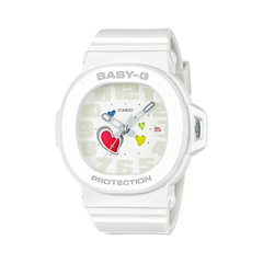 Indulge your playful side — an analog BABY-G featuring a color-changing heart motif. The whimsical and dynamic face design automatically brings something new each day. The colors peeping through the four heart-shaped openings, which change as the color wheel beneath the dial rotates daily, and the colorful date display bring a note of fun to your everyday. You can also change the colors any time by rotating the crown to suit your mood. Rounded, raised Arabic numerals for an easy read and a seconds hand shaped like Cupid’s arrow piercing the hearts — these uniquely BABY-G design elements bring even more charm and whimsy to this adorable analog watch. The detachable bezel is totally tough, but easy to use. In a simple matte finish, it lets the heart-themed dial design shine, while protecting the watch glass and crown to stand up to the active moments of your daily life. The bezel can also be easily removed without special tools so you can access the crown to manually change the time, date, or color combination. Even uncover a charming hidden design detail — the heart motif on the side of the case — revealed only when the bezel is off! More than uniquely charming and colorfully playful, this watch delivers on function, too — with shock-resistant construction, water resistance up to 100 meters, and more, all to keep up with your life adventures.