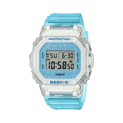 While maintaining the compact, angular style of the BGD565, this BABY-G takes on see-through color with a bezel and band in translucent resin and glittering dial for an added touch of luxe flair.More than an accessory that sparkles, these watches also deliver shock-resistant construction, 100-meter water resistance, and more, all to keep up with your active days.
