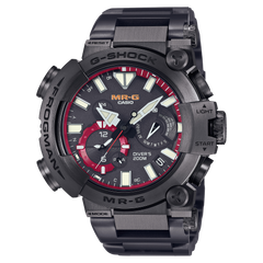 A premium, full-metal G-SHOCK MR-G timepiece for diving — the titanium armor-clad, airtight MRG-BF1000 with ISO 200-meter water resistance — joins the FROGMAN family of full-fledged diver’s watches. A G-SHOCK diving watch carries the reliability of the G-SHOCK name to the depths, providing you with peace of mind that you have the best titanium diving watch.This MR-G G-SHOCK diver’s watch takes the unique asymmetrical design, screw-lock case back and distinctive diving frog character — which were so popular when FROGMAN came out back in 1993 — to a whole new level. Originally produced in resin, the complex design has now been remade in titanium, with each component crafted separately and polished meticulously for an entirely new feel of high-end quality. The G-SHOCK diving watch is built with an intricate combination of over 70 exterior components, including an O-ring waterproof seal to deliver outstanding G-SHOCK FROGMAN water resistance and special buffers to strengthen the shock-resistant structure — all while maintaining the beauty of form the Casio FROGMAN MR-G line of diving watches is known for.Protective parts-- crafted from a highly water-resistant fluoro rubber-- are built into the crown and buttons to increase shock resistance. The crystal is scratch resistant and finished with an anti-reflective coating. The titanium exterior is rust resistant, and the titanium watch band has been painstakingly crafted to ensure a comfortable fit by making it easily adjustable to fit over a wet suit. This airtight G- SHOCK FROGMAN diving watch is engineered for elite performance on diving adventures.So, we’ve made a mini submersible that Jacques Cousteau could be proud of, but what else can it do? When in Dive Mode, the hour hand, minute hand, second hand, and 24-hour hand will overlap and all move to the 12-o’clock position, which indicates that the watch is ready to start dive-time measurement. All three hands work in unison, and the dive time is measured in units of one second up to 1 hour, 59 minutes, 59 seconds (2 hours). Diving log data is automatically sent to the Casio app via Bluetooth®. You can also check the tide level by specifying a port in the app from 3,000 worldwide locations which will then send the data to the G-SHOCK FROGMAN dive watch. Tough Solar power and a Super Illuminator LED light ensure reliability.A G-SHOCK dive watch that’s elegant, rigorous, and reliable, the MRGBF1000B-1A boasts G-SHOCK MR-G style with FROGMAN performance. Discover more design and performance details of the G-SHOCK MRGBF1000B. Returns will only be accepted if product is in original packaging and protectant film is in place.