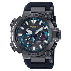 A premium, full-metal G-SHOCK MR-G timepiece for the sea — the titanium armor-clad, airtight MRGBF1000 with ISO 200-meter water resistance joins the FROGMAN family of full-fledged diver’s watches.This MR-G diver’s watch takes the unique asymmetrical design, screw-lock case back and distinctive diving frog character — which were so popular when FROGMAN came out back in 1993 — to a whole new level.Originally produced in resin, the complex design has now been remade in titanium, with each component crafted separately and polished meticulously for an entirely new feel of high-end quality. The watch is built with an intricate combination of over 70 exterior components, including an O-ring waterproof seal to deliver outstanding FROGMAN water resistance and special buffers to strengthen the shock-resistant structure — all while maintaining the beauty of form the MR-G line is known for.For enhanced strength, we’ve developed a protective structure with fluoro rubber buffers installed between the multiple bezel parts. This structure features face-guarding functionality that helps to absorb shocks from the front and the sides, as well as protecting the crystal.The dedicated MR-G module features a gold-plated retainer plate. The screw-lock case back is fit with sapphire crystal finished in vibrant blue vapor deposition and engraved with the iconic FROGMAN diving frog character. Dura Soft, a durable and comfortable fluoro rubber, is used for the band, and Ti64 titanium alloy for the buckle and band loop. Simply remove the side pins while pressing the buttons on the lugs’ undersides to quickly and easily swap out the band. More than just handsome, this timepiece provides superior functionality, as well. Equipped with Bluetooth®, the hour and minute hands overlap and work in unison to form a single hand when in diving mode, making the time spent underwater (minutes) easy and intuitive to see and delivering high visibility. Download the dedicated app to pair with your smartphone and easily display tide data for more than 3,000 locations around the world. Check dive logs on your smartphone and get more details on data tracked by your watch.