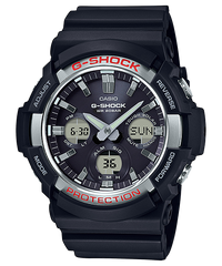 From G-SHOCK, the watch brand that is constantly setting new standards for timekeeping toughness, come new models based on the big case Tough SolarGAS-100.Variations on a basic black design are created by three different bezels. The GAS-100 comes with a stainless steel bezel for a standard design that goes well with a wide range of fashion styles, while the GAS-100G has a stainless steel bezel with a gold ion-plated finish for touch of distinctive beauty. The GAS-100B has a black aluminum bezel for a cool design.A CASIO original molding process is used to produce deposition coated hour markers that combine with the metal bezels to create a look of elegance.• Tough Solar• Hand shift feature• Super Illuminator (double) illuminates the face and digital display