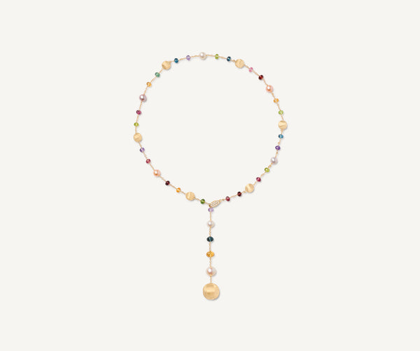 With its colourful mix of gemstones and pearls, this sophisticated lariat necklace features an eye-catching diamond clasp. The 18kt yellow gold beads are hand-engraved using an ancient Florentine technique which gives our gold a fine, brushed texture.