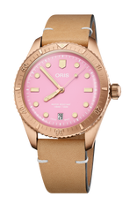 • Movement Feature: Centre hands for hours, minutes and seconds, date window, instantaneous date, date corrector, fine timing device and stop-secondA Fresh Palette: The Divers Sixty-Five ‘Cotton Candy’ is a beacon of joy. It has an all-bronze case, bezel, crown, and bracelet with vibrant dial colours. The 38mm case is unisex, powered by a Swiss Made mechanical movement. These watches symbolize optimism and better times.