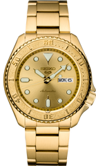 Show your style. Make your move. For over 50 years, Seiko 5 Sports has delivered consistently high levels of reliability, durability, and performance. For dependable timekeeping in your everyday life, this exceptional watch is powered by an automatic movement with a power reserve of approximately 41 hours and features a day/date calendar, LumiBrite hands and markers, and a see-through caseback. With a gold tone-on-tone stainless steel case, bracelet, and metallic dial framed by a rotating bezel, this versatile watch is 100 meter water resistant- perfect for your style no matter what your day has in store.