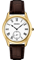 From the Essentials Collection. Offering classic dress/sport designs, in two sizes to suit anyone’s personal style, the Essentials Collection provides the ideal solution for everyday wear. Crafted of stainless steel in rich gold finish, this sophisticated design features a white dial with elegant Roman numerals, finely shaped hands and a seconds subdial. Includes a brown leather strap, classic cabochon crown and a scratch-resistant sapphire crystal. 5 bar, 50M Water Resistant