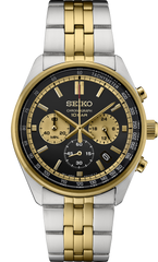 From the Essentials Collection. Inspired by motor sports, this dynamic chronograph features a black dial with bold, highly legible gold subdials at 3 and 9 o’clock styled to suggest a racecar instrument panel. Framed by a black tachymeter outer ring, the dial also offers a date calendar as well as a 24-hour subdial. The chronograph provides measurement of up to 60 minutes of elapsed time in 1/5-second increments. Crafted of stainless steel with mirror and hairline two-tone finish and tri-fold push button release clasp. 10 bar, 100M Water Resistant