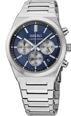 From the Essentials Collection. A modern take on a classic style, this contemporary watch features a sleek, angular case and bracelet design perfect for both dress occasions and everyday wear. The blue pressed pattern dial showcases three subdials, simple stick indices, a date calendar, and LumiBrite hands and markers. Crafted of stainless steel with a scratch-resistant sapphire crystal, this versatile timepiece is equipped with a chronograph function that measures up to 60 minutes of elapsed time in 1/5 second increments and includes a secure screwdown caseback and tri-fold push button release clasp. 10 bar, 100M Water Resistant