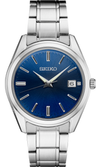 From the Essentials Collection. With classic dress/sport styling, this perfectly tailored design combines sophisticated minimalism with versatility. The sunray-finish blue dial features a date calendar and LumiBrite hands. In stainless steel, with sapphire crystal for superior scratch resistance. 10 bar, 100M Water Resistant