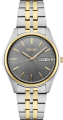 From the Essentials Collection. Offering classic dress/sport designs, the Essentials Collection provides the ideal solution for everyday wear. Crafted of stainless steel in versatile two-tone finish, this perfectly balanced watch features a gray sunray dial with day/date calendar and sleek gold stick markers for a superb blend of clarity and style. 10 bar, 100M Water Resistant