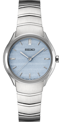 From the Essentials Collection. With sleek sophistication, this distinctively modern watch makes an immediate style statement. The clean, minimalist dial, in pale blue with simple stick markers, features a subtly varying metallic texture for added visual interest, while the soft curves of the bracelet are highlighted by a mirror and hairline finish. In stainless steel, this memorable timepiece includes a tri-fold push button release clasp. 5 bar, 50M Water Resistant