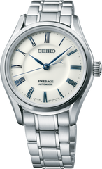 Presage Craftsmanship Series Arita Porcelain. Offering the finest in Japanese mechanical watchmaking, the Presage Collection blends precision technology with superior craftsmanship and design. Arita porcelain, prized for its unique blue and white colors, is among the classic expressions of Japanese artistry showcased in the Presage Craftsmanship Series, used to create high-strength, three-dimensional dials, individually crafted by master artisans in a multi-step process combining technical innovation with centuries of inspiration. In Hakuji (pure white), the elegant Roman numeral dial is uninterrupted by subdials or inserts to showcase the beauty of the porcelain. The 24-jewel automatic movement beats at a frequency of 21,600 vibrations per hour with a power reserve of approximately 70 hours and offers manual winding capability. Crafted of stainless steel, this exquisite watch includes a dual-curved anti-reflective sapphire crystal and tri-fold push-button release clasp. 5 bar, 50M Water Resistant