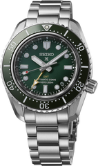 1968 Heritage Diver's GMT. Designed for those who treat life as the ultimate adventure, the Seiko Prospex line meets every challenge with technological excellence and style. Part of a rich legacy of innovation in high-intensity timekeeping, Prospex continues to celebrate a long history of sports watch expertise with re-creations and re-interpretations of landmark achievements. This extraordinary timepiece, re-interpreting Seiko’s landmark 1968 diver’s watch, showcases the brand’s first mechanical GMT movement in a diver’s watch, caliber 6R54. Providing a power reserve of approximately 72 hours, the longest of any Seiko mechanical watch, this 24-jewel automatic GMT movement beats at a frequency of 21,600 vibrations per hour and offers manual winding capability. The GMT hand can be set independently in one-hour increments, without interrupting the time-of-day hands, to provide a second time zone reading at a glance. Framed by a Made-in-Japan green ceramic uni-directional rotating elapsed timing bezel with knurled edge for enhanced operability, the rich green dial features a date calendar, gold GMT hand, and large LumiBrite markers and hands for enhanced legibility. Crafted of stainless steel with super-hard coating, this superbly functional timepiece includes an anti-reflective sapphire crystal, screwdown crown and caseback, new three-link, slim profile bracelet, and a tri-fold push button release clasp with secure lock and extender, and follows ISO standards for scuba diving to depths of up to 200 meters. 200m Water Resistant