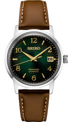 Seiko Presage Cocktail Time. Offering the finest in Japanese mechanical watchmaking, the Presage Collection blends precision technology with superior craftsmanship and design. Taking a more playful approach to the popular Cocktail theme line, this delightful watch is part of a group reflecting the casual charm of a vacation bar. Inspired by the Mojito cocktail, its gradated rich green dial features a pressed pattern reminiscent of the light reflected by a classic cocktail glass, as well as numerals styled to recall the printing on a vintage liquor label. The 23-jewel movement, with manual and automatic winding capability, beats at a frequency of 21,600 vibrations per hour, with a power reserve of approximately 41 hours. Crafted of stainless steel, this distinctive timepiece includes a calendar, box-shaped crystal, screwdown see-through caseback, smooth tan leather strap and tri-fold push button release clasp. 5 bar, 50M Water Resistant