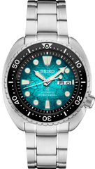 Prospex U.S. Special Edition. Designed for those who treat life as the ultimate adventure, Seiko Prospex keeps moving forward, meeting every challenge with technological excellence and winning design. With an intricately patterned turquoise dial inspired by turtle shells, this exciting Special Edition celebrates Prospex’s ongoing efforts to promote ocean exploration and conservation. For reliable timing in rough waters, the 24-jewel automatic movement, which beats at a frequency of 21,600 vibrations per hour, provides a power reserve of approximately 41 hours and offers manual winding capability. Framed by a black ceramic uni-directional rotating elapsed timing bezel, the dial features LumiBrite hands and markers, as well as a day/date calendar in both English and Kanji. Crafted of stainless steel, with scratch-resistant anti-reflective sapphire crystal, and secure screwdown crown and Special Edition caseback with sea turtle image, this durable timepiece follows ISO standards for scuba diving at depths of up to 200 meters. Includes additional green silicone strap. 200m Water Resistant