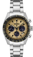 Seiko Speedtimer Solar Chronograph. Designed for those who treat life as the ultimate adventure, Seiko Prospex keeps moving forward, meeting every challenge with technological excellence and winning design. Combining precision timing with wearability and the energy efficiency of solar power, this exceptional watch, inspired by Seiko’s first precision chronographs, developed for international sporting competitions in 1964, provides chronograph measurement of up to 60 minutes of elapsed time in 1/5-second increments and includes a split time function. The solar cell, powered by any light source, with no battery change required, offers a 6-month power reserve when fully charged. Framed by a black tachymeter bezel, the yellow dial, with distinctive sand-blasted texture, features three black subdials, including a 24-hour indicator, as well as a date calendar and beige LumiBrite hands and markers. In stainless steel, with curved anti-reflective sapphire crystal, this rugged timepiece also offers the security of a screwdown caseback and tri-fold push button release clasp. 10 bar, 100M Water Resistant