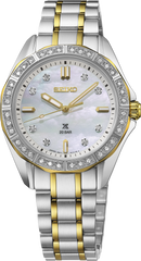 Prospex Sea Series. Designed for those who treat life as the ultimate adventure, the Seiko Prospex line meets every challenge with technological excellence and style. Taking on a sporty, yet refined impression, this beautiful series, created with a sleek profile and proportions specially tailored for a sophisticated look, features both enhanced water-resistance for marine adventures and an elegance suited for finer occasions. An extraordinary blend of form and function, the impressive timepiece offers a dazzling bezel set with 36 diamonds, framing a luxurious mother-of-pearl dial with gold accents, 8 additional diamonds, and LumiBrite hands for superior visibility in low-light conditions. Crafted of stainless steel with a two tone finish, this gorgeous watch is topped with a scratch-resistant sapphire crystal with anti-reflective coating on the inner surface and is equipped with a built-in crown protector, a tri-fold push button release clasp, and a secure screwdown caseback. 20 bar, 200M Water Resistant