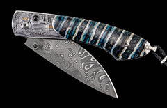 The Spearpoint ‘Deco Train’ features mesmerizing hand-engraved bolsters with silver and 24K gold inlays by Steve Adams, and scales from a 10,000 year-old fossil Woolly Mammoth tooth. The blade is hand-forged 'Boomerang' damascus by Chad Nichols; the one-hand button lock and the thumb stud are set with black onyx gemstones. A remarkable design that gives you an instrument with a full-size secure grip, and a versatile deep-belly blade, the Spearpoint epitomizes William Henry’s core philosophy – that superlative function deserves to be elevated to superlative art. The ‘Deco Train’ features some of the most exotic materials, artistry and forged metals that are the hallmark of William Henry's collections; a timeless heirloom to be proudly worn and used for a lifetime before being handed-down to another generation.