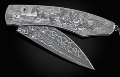 The Spearpoint ‘Wild and Free III’ features a stainless steel frame, hand-engraved in Italy by Bottega Incisioni. The blade is hand-forged 'Lonesome Highway' damascus by Chad Nichols; the one-hand button lock and the thumb stud are set with spinel gemstones. A remarkable instrument with a full-size secure grip and versatile deep-belly blade, the Spearpoint epitomizes William Henry’s core philosophy – that superlative function deserves to be elevated to superlative art. The ‘Wild and Free III’ features hand-forged metals, and hundreds of hours of microscopic hand-engraving which are the hallmark of William Henry's most exclusive creations; a timeless heirloom to be proudly worn and used for a lifetime before being handed-down to another generation.