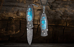 The 'Kingman' belongs equally on your neck as a pendant, in your pocket as a keychain knife, or in a museum. is hand-forged stainless damascus steel, and the handle is crafted from hand-forged & etched carbon damascus steel, inlaid with 'Zinc Matrix' turquoise. Accents of smoky quartz gemstone, sterling silver, and stainless steel. On a sterling chain. (Optional 18", 20", or 24" chain by request)