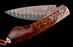 The Spearpoint 'Rustic' features a beautiful frame in William Henry's signature (and patent pending) 'Wave' Mokume, inlaid with a stunning scale in desert ironwood. The blade is 'copper wave' damascus steel with an extra sharp core in VG-5 steel. The one-hand button lock and the thumb stud are set with citrine gems. A remarkable design that gives you an instrument with a full-size secure grip, and a versatile deep-belly blade, the Spearpoint epitomizes William Henry’s core philosophy – that superlative function deserves to be elevated to superlative art. The 'Rustic' also features 2 of William Henry's most admired and distinctive forged metals; a timeless heirloom to be proudly worn and used for a lifetime before being handed-down to another generation.