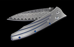 The Gentac ‘Saturn II’ features a light and resilient frame in aerospace grade titanium, and anodized blue titanium pocket clip. The blade is extra-strong VG-10 core 'Wave' damascus; the one-hand button lock and the thumb stud are stainless steel. An exceptional design that offers rigorous performance in a sleek, comfortable knife, the ‘Saturn II’ features some of the hi-tech and forged metals that are the hallmark of William Henry's collections; a distinctive personality statement to be worn and used for a lifetime.